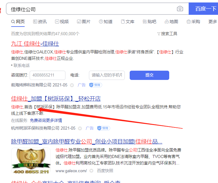 杭州樹派環(huán)保科技有限公司利用我司商標(biāo)"佳綠仕"進(jìn)行百度搜索關(guān)鍵詞宣傳,嚴(yán)重影響我司合法權(quán)益。